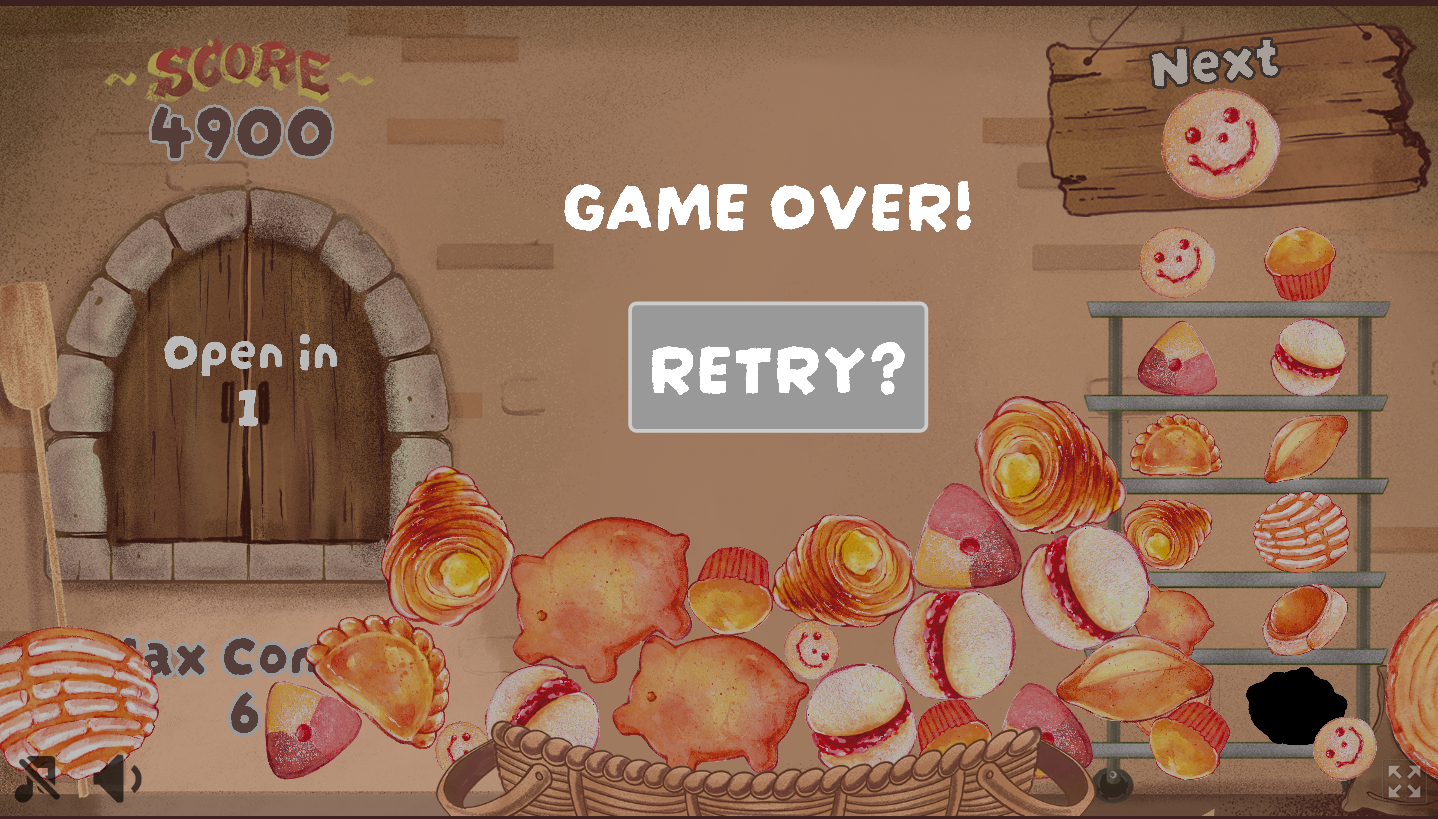 Compared to the usual watermelon game, the shape of the pastries (especially the pig pastry) is uneven and tends to get stuck, which increases the difficulty, but it’s really well-balanced because you get a sale every 5 falls, and things sell out.